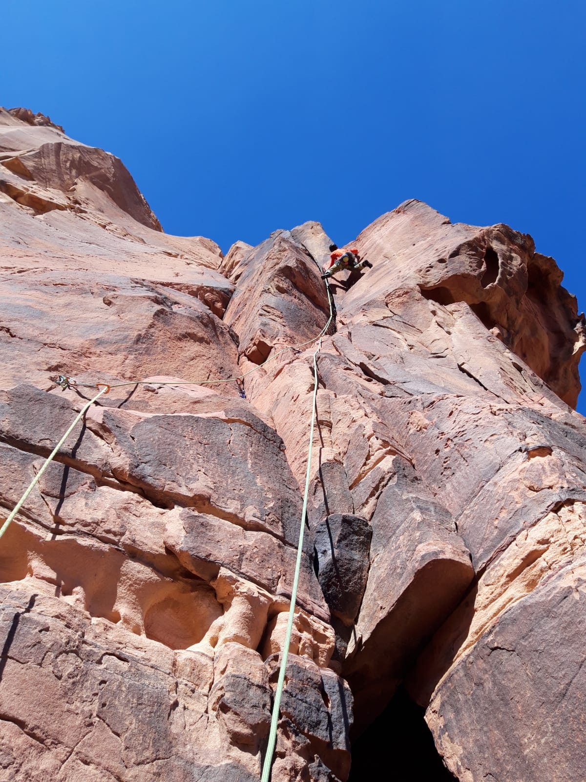 L4 (7b+, 25m): Es el largo que más nos costó resolver, un paso muy a bloque en el desplome con una chapa que cuesta chapar, seguido de una placa más fácil pero donde no hay que bajar la guardia si quieres encadenar.